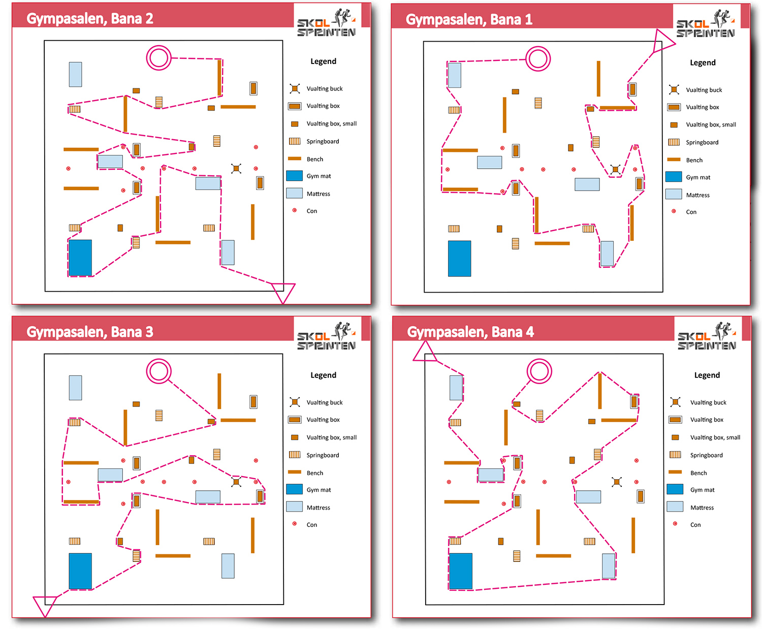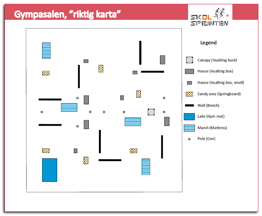 Using a Master Map with gym floor lines visible, you can put out the objects in the right position more easily. These lines are not on the ”Student Map” or on the exercise maps.