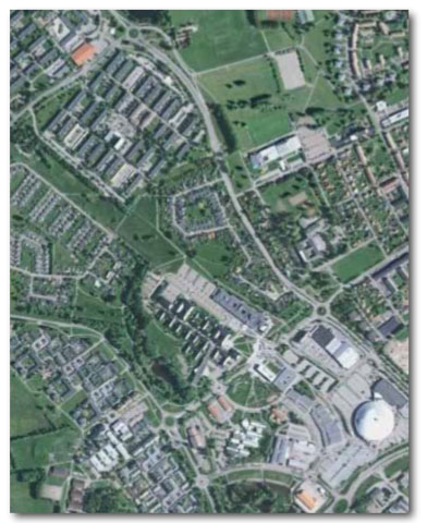 WE STEER the spacecraft towards Dalarna and suddenly Lake Runn appears with the cities of Falun and Borlänge to the left of the lake and the meandering river Dalälven which is most similar to a long snake. The braking rockets light up and it’s time for landing. The goal is Tjärna Äng school in Borlänge. The white ”football” is visible from the sky. The Dome attracts the pilot’s attention and it is this building we use as the ”last safe” or ”attack point” to find the school as fast as possible.