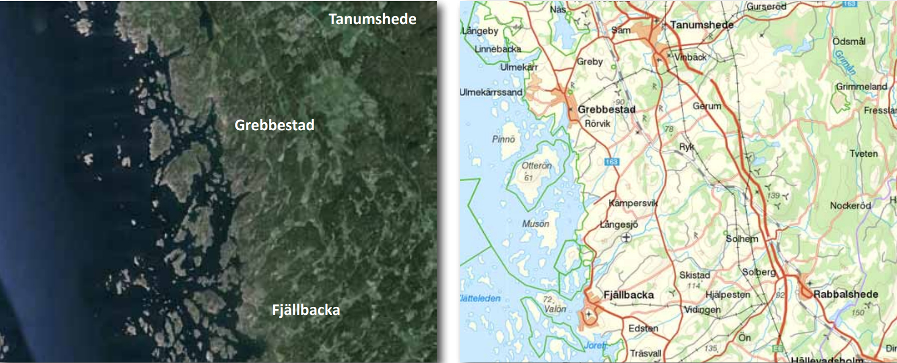 The cities of Tanumshede, Grebbestad and Fjällbacka are not on the Nordic map but on this map you can add more detail because the area is much smaller. Houses and roads (yellow colour), forest (green colour), lakes (blue colour) as well as fields and meadows (white colour) appear very clearly. This map is suitable to use when you are orienteering by bicycle or car.