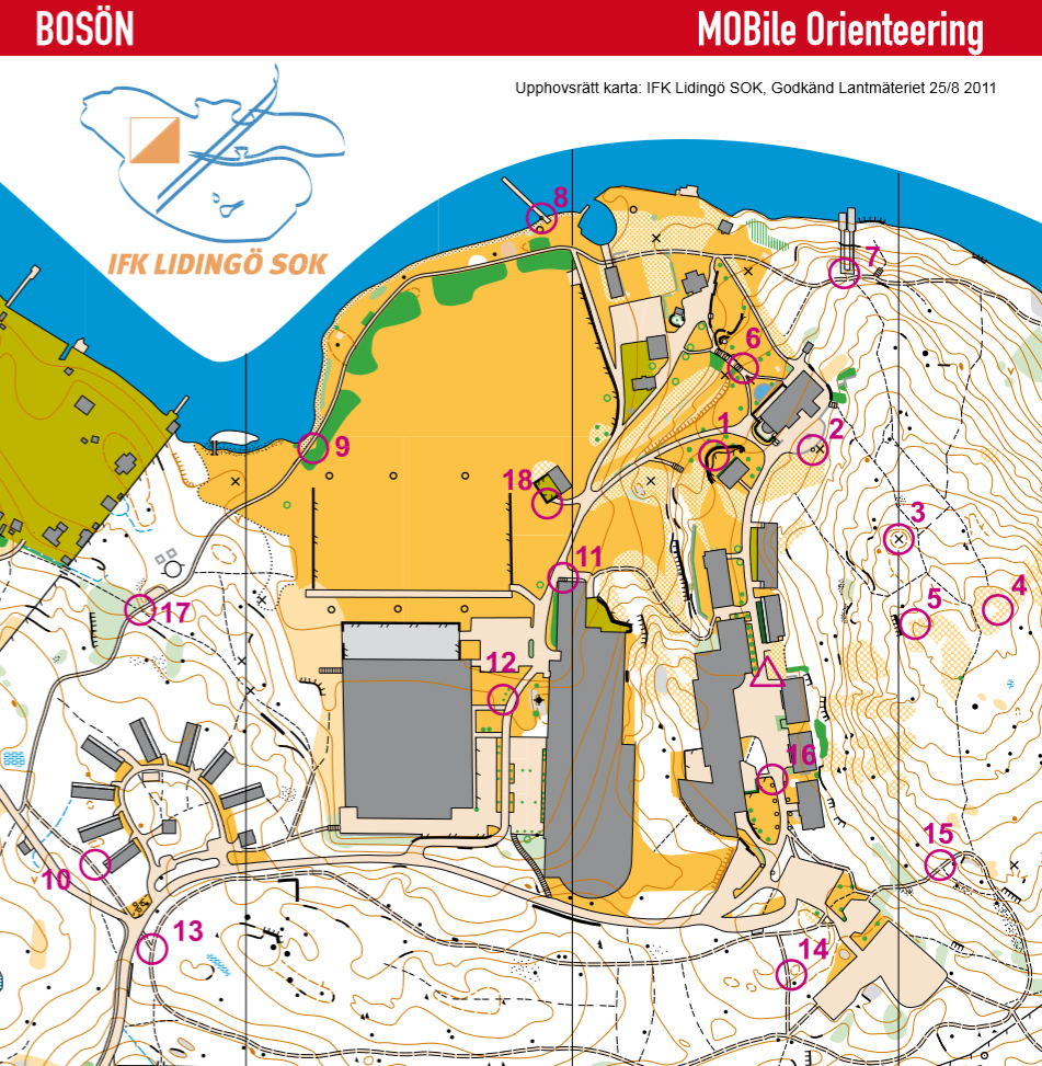 Permanent orienteering courses can be useful to get more spontaneous use of maps. Photoorienteering in different ways usually work very well. Bosön IFHS is an example of how to use the map as a traditional paper map or downloaded in the phone via the MOBO application. The start of the MOBO (Mobile Orienteering) is outside the reception. Each checkpoint (total 18 pcs, 2 shown here) is marked as the picture to the right (number 1-18). With MOBO app you are also allowed to “punch” at each checkpoint with the phone (via barcode scanning). The app is free of charge and works for Android, Apple and Windows. You can also download maps to your phone or tablet from the website www.boson.nu.