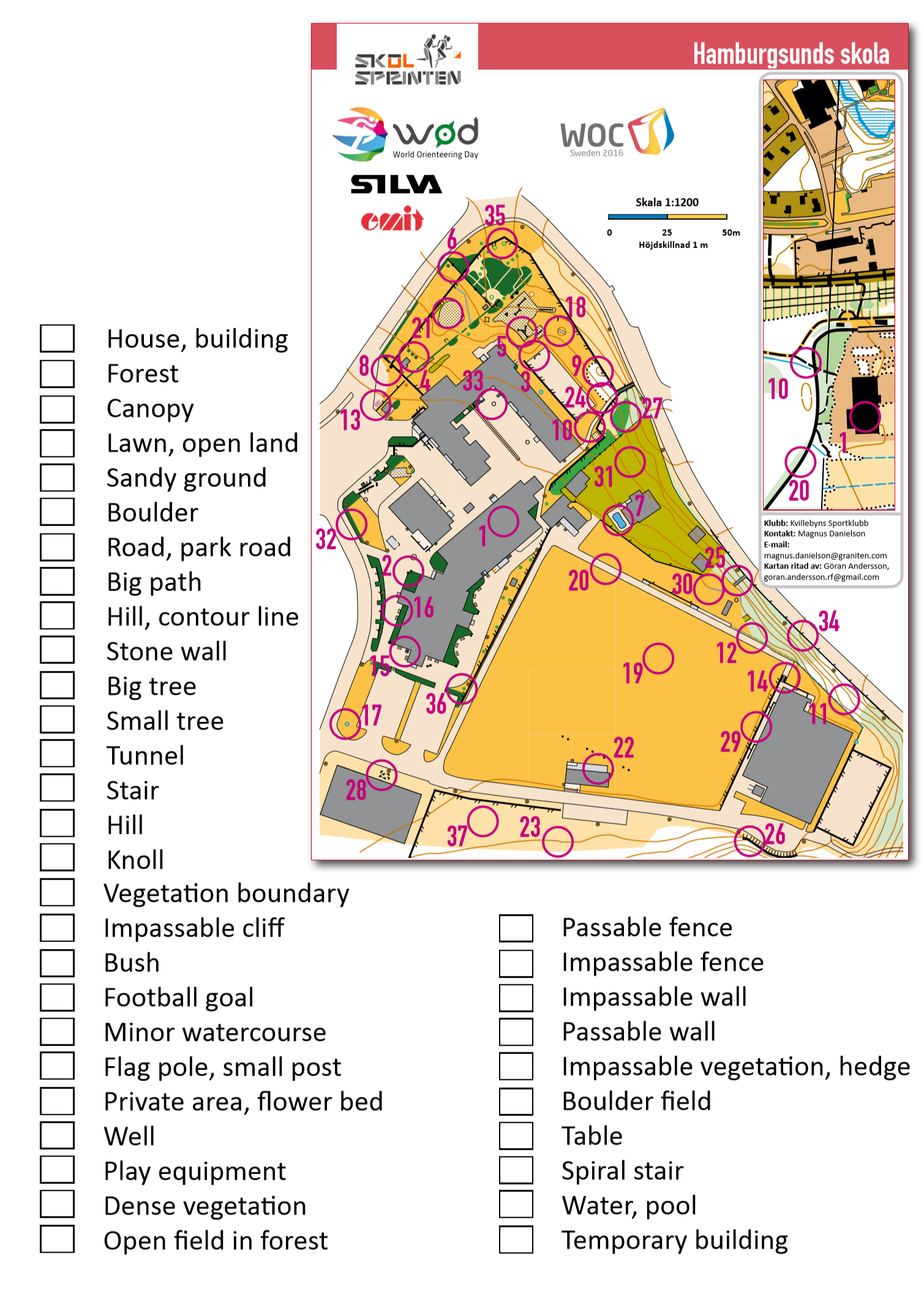 The map is drawn according to ISSOM. It differs in some details from the forest map (inset). Complete in the boxes with numbers you believe match the controls (correct answers on page ):