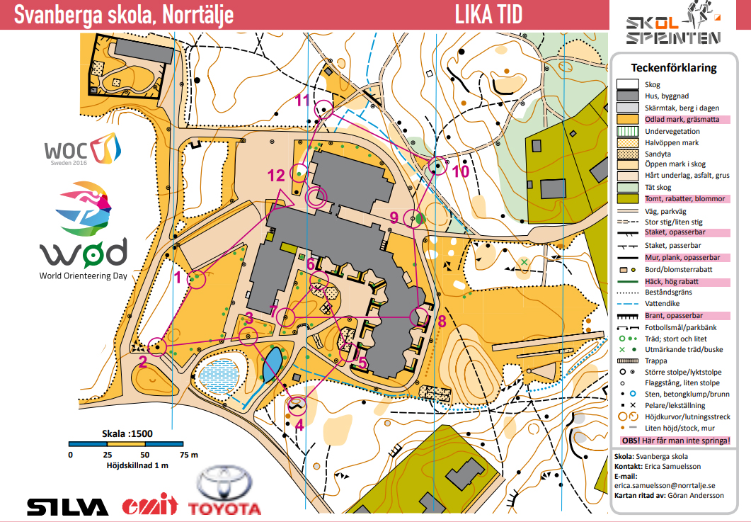 After school, during volunteer time, we put on a ”competition” in orienteering. The difficulty level is equivalent to ”Challenge 1-2” and the participants can walk, jog or run the course. The students perform the course at least twice. The time of the first lap the students have to ”dot” on the next lap. They are free to try as many times as they want. The student who comes closest to her/his first time i.e. ”equal time” is the winner of the competition.